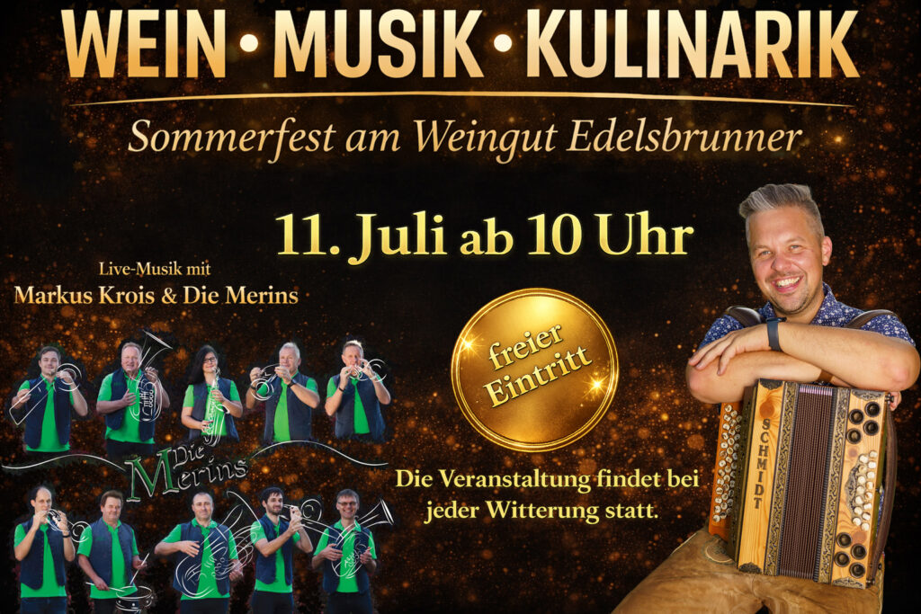 Am Samstag, 11. Juli ab 10 Uhr laden wir herzlich zu unserem ersten Wein-Musik-Kulinarik-Fest am Weingut Edelsbrunner ein. Freut euch auf einen genussvollen Sommertag in entspannter Atmosphäre mit allem, was das Herz begehrt.